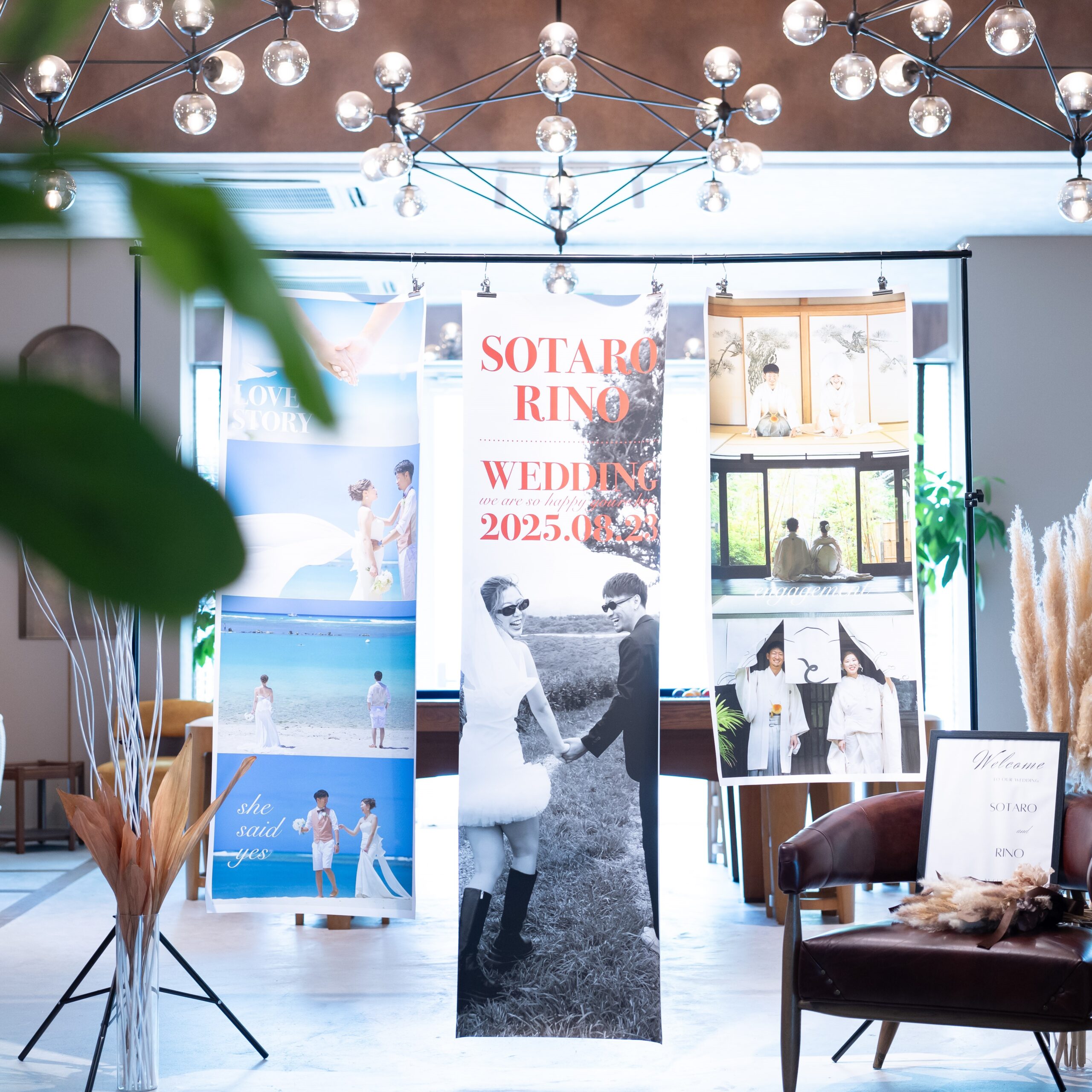 エントランスの扉を開けた瞬間から二人の素敵な写真と装飾がお出迎え
