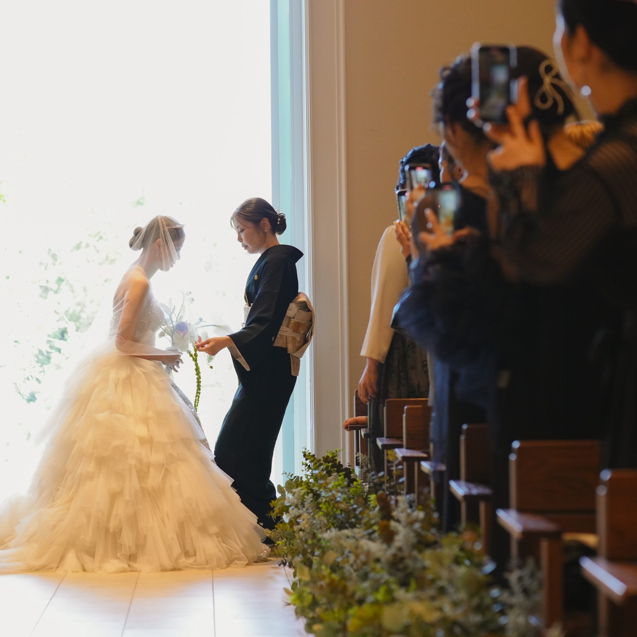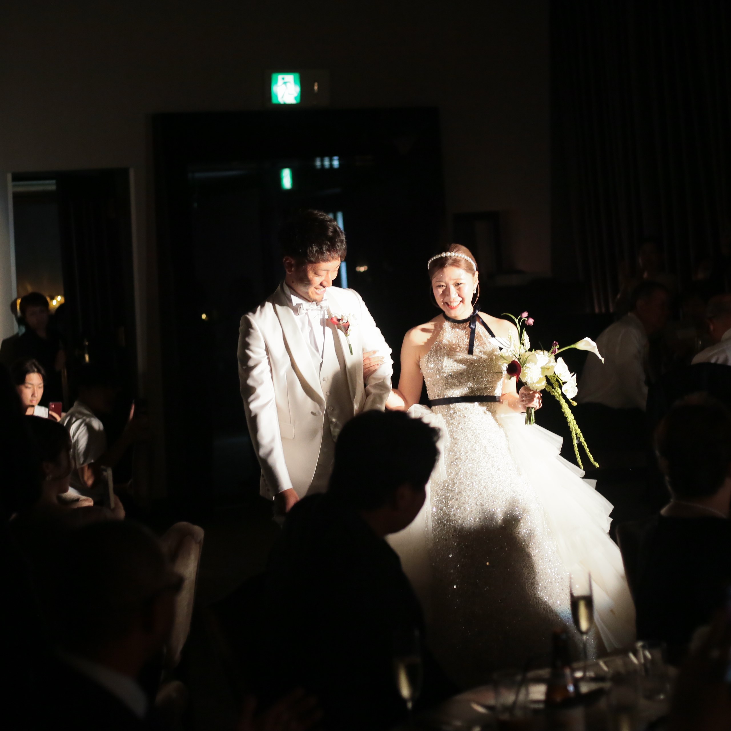 挙式からイメージチェンジをして、ゲストが待つパーティ会場へ