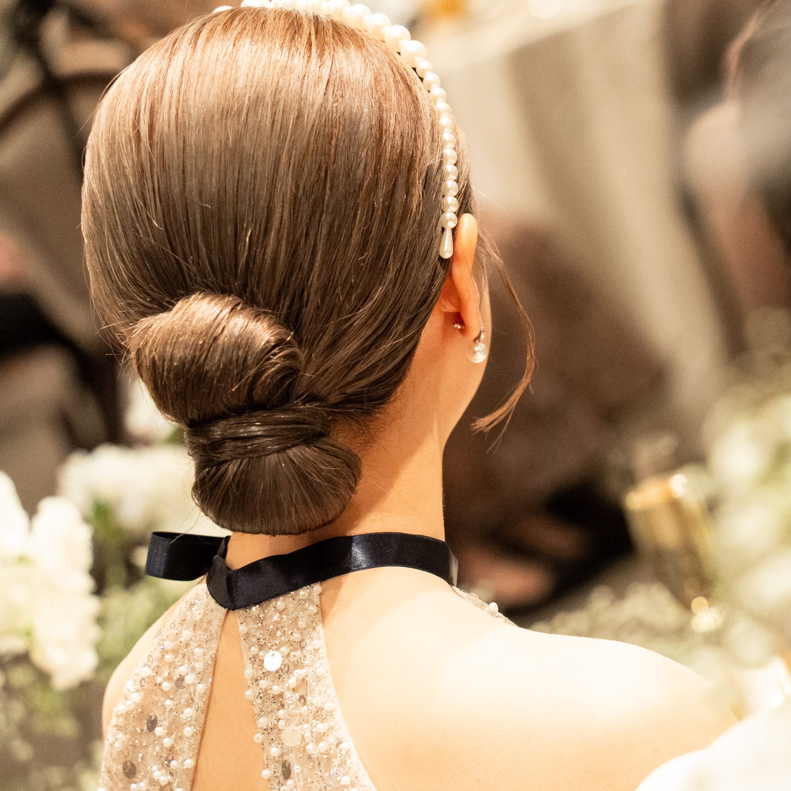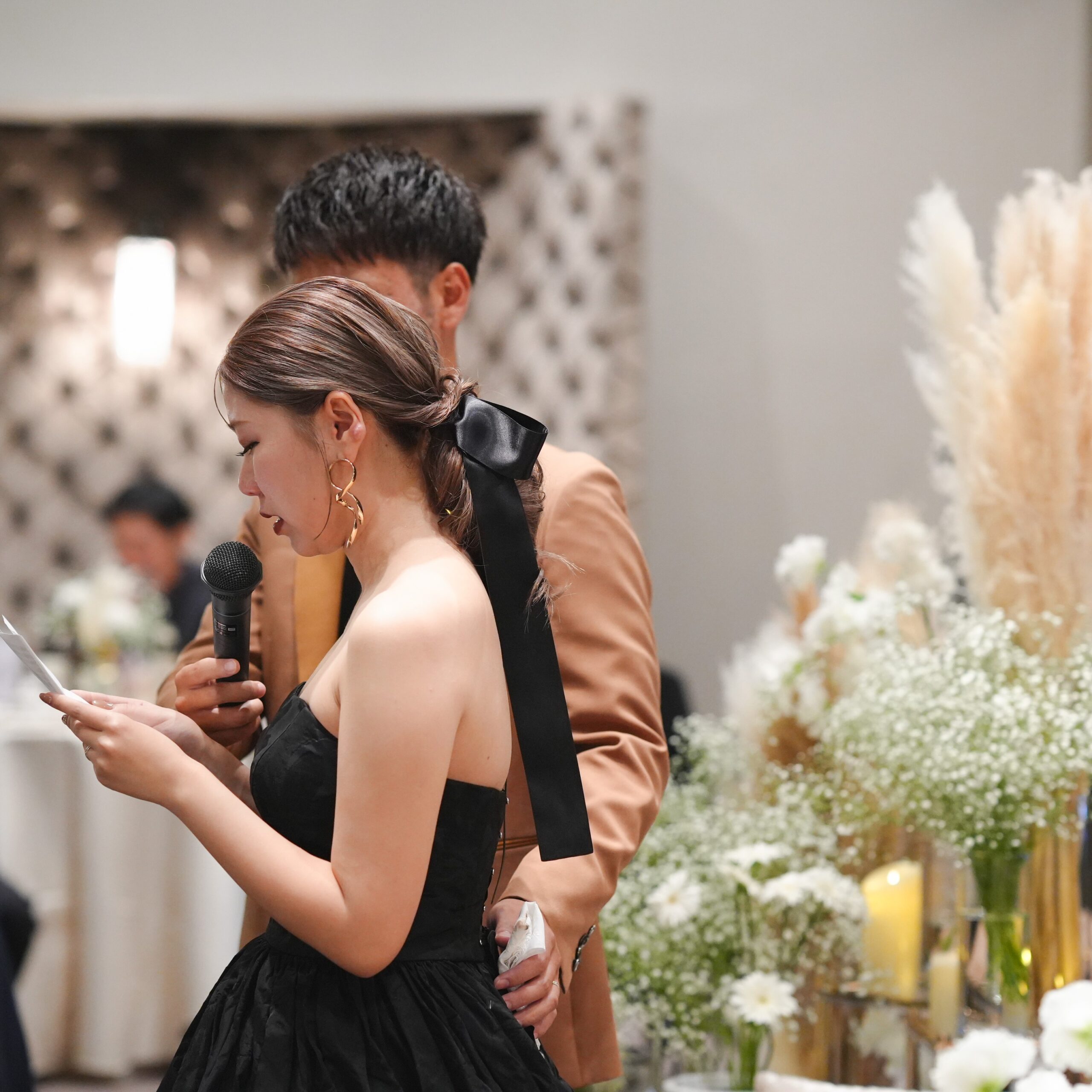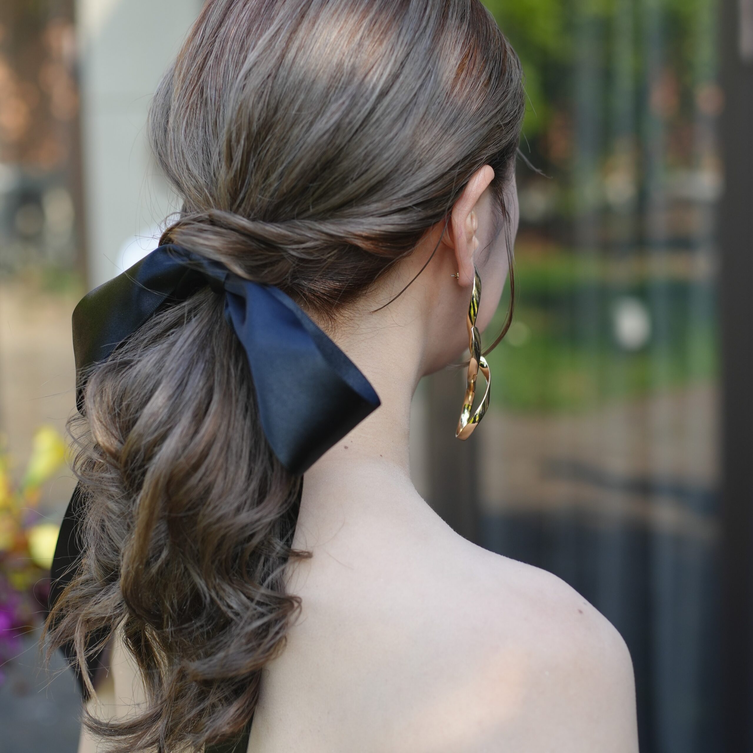 カラードレスではブラックリボンにふわっとダウンポニーでかわいらしく
